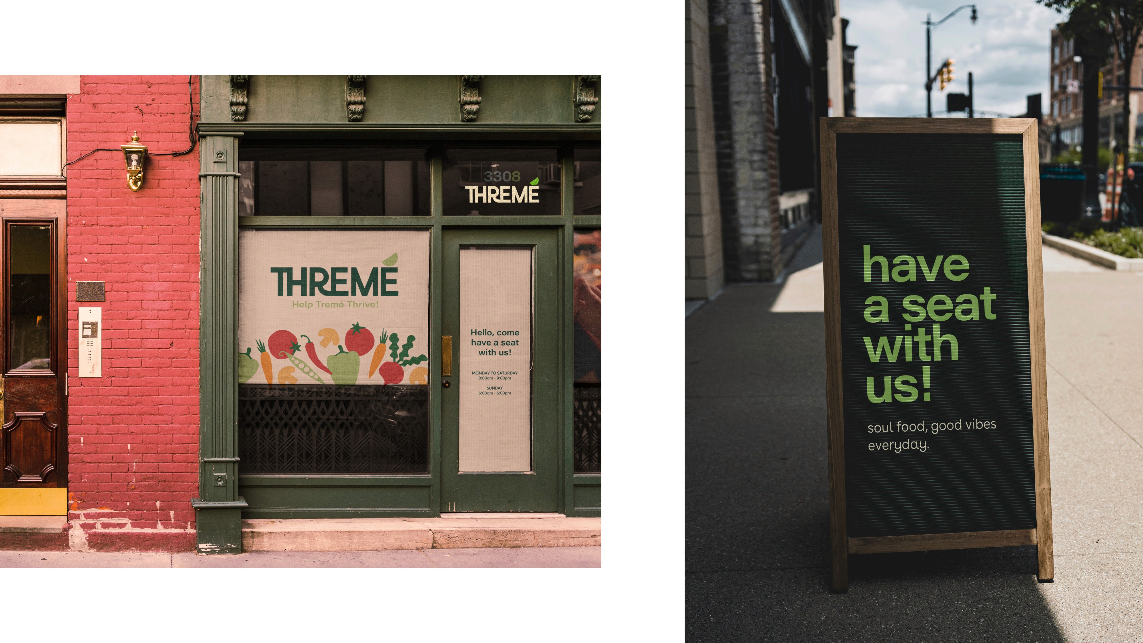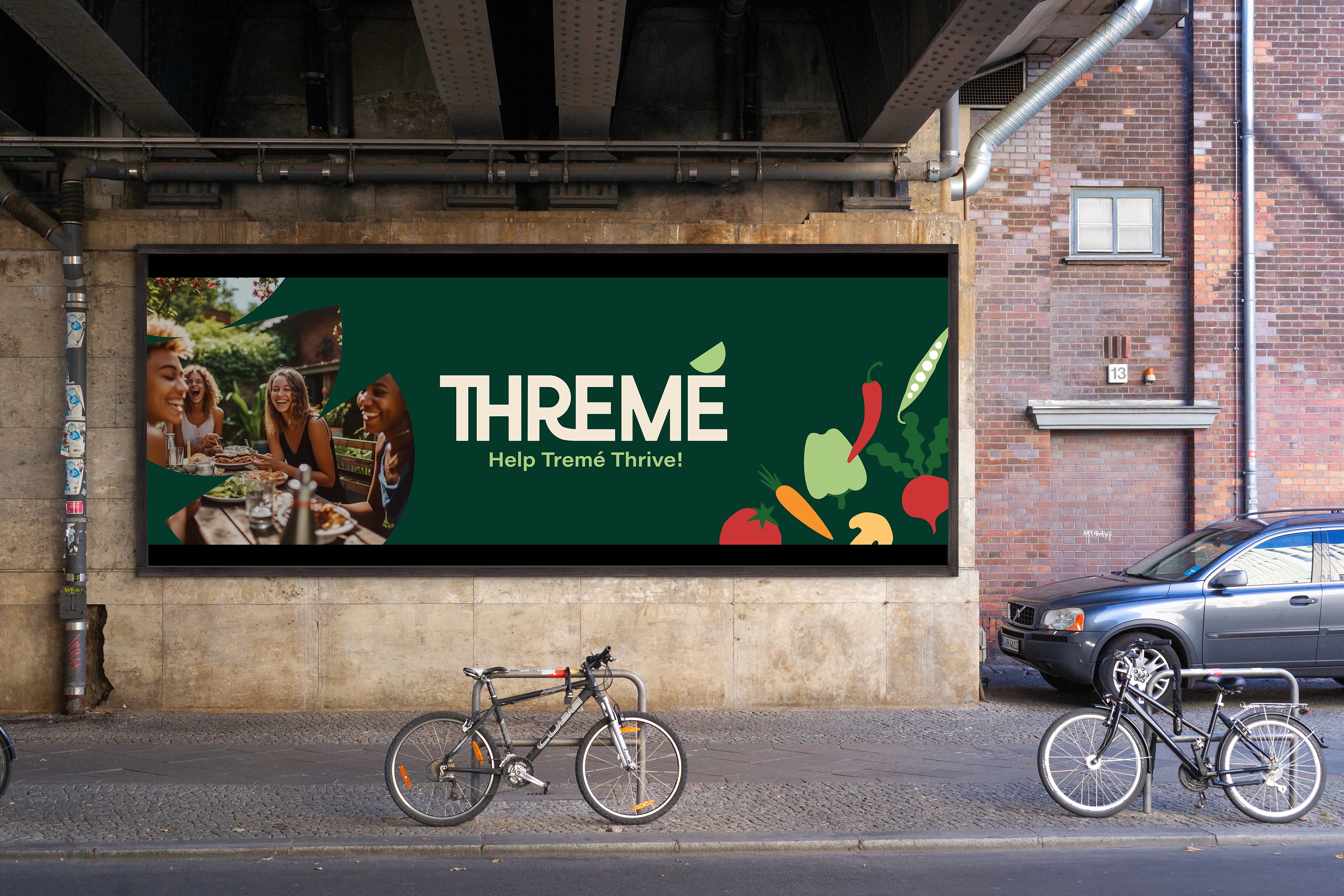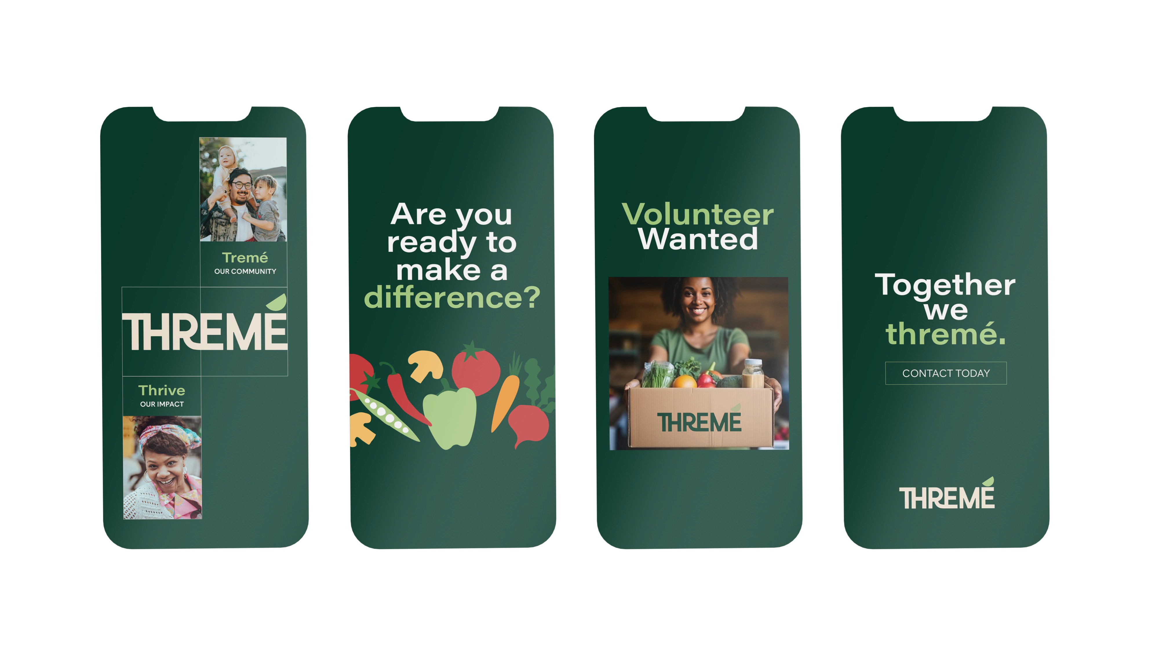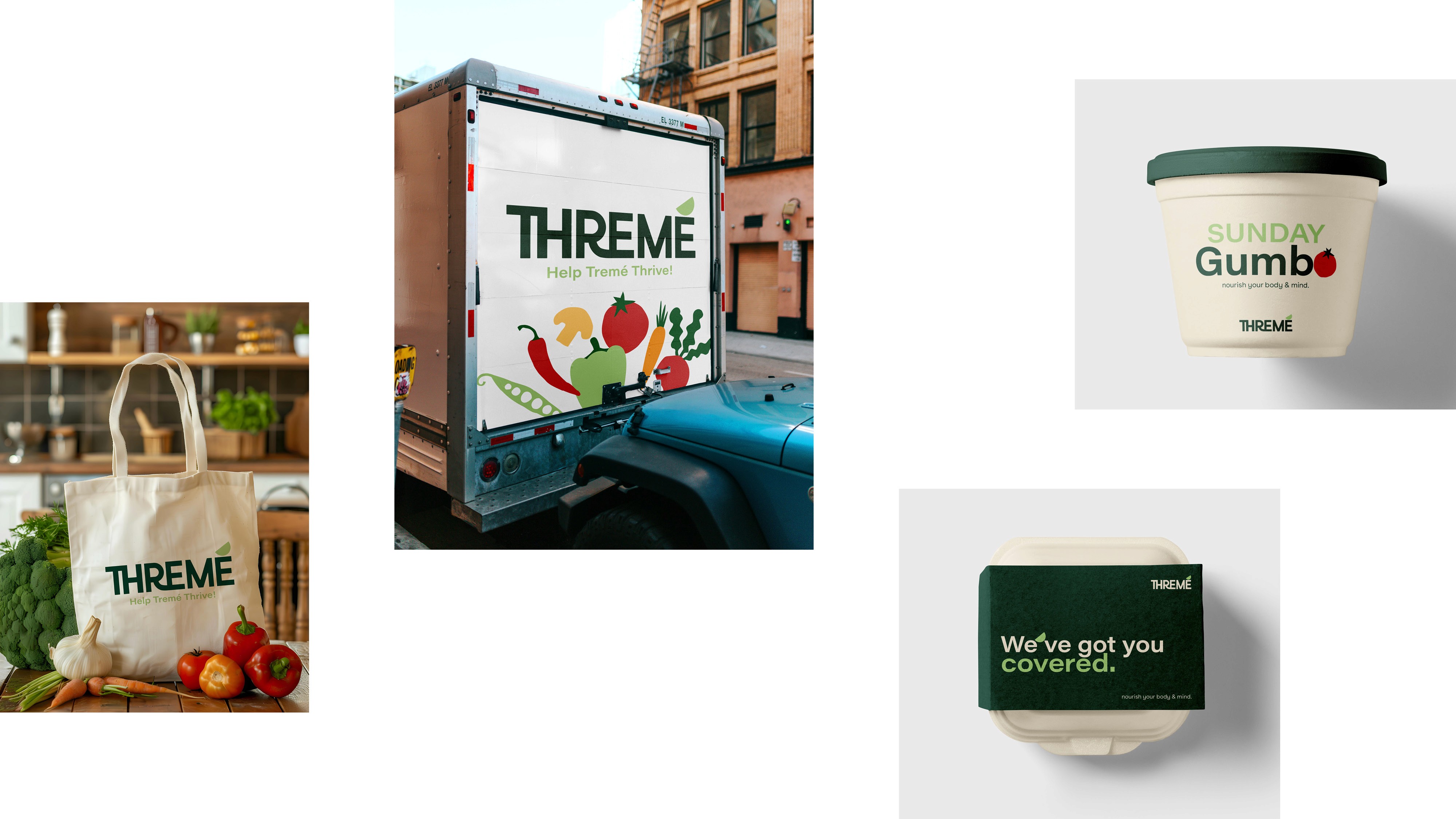 Thremé is a start-up food charity based in Treme, New Orleans. They aim to help individuals who are struggling to access affordable fresh food and nutrition education, and foster a sense of community. Inspired by the vibrant lifestyle of New Orleans, the brand design focuses on bringing the “together we thrive” concept to life through considerate human-centred print & digital outlets, and ensures Threme’s diverse audience can relate and engage with the brand.